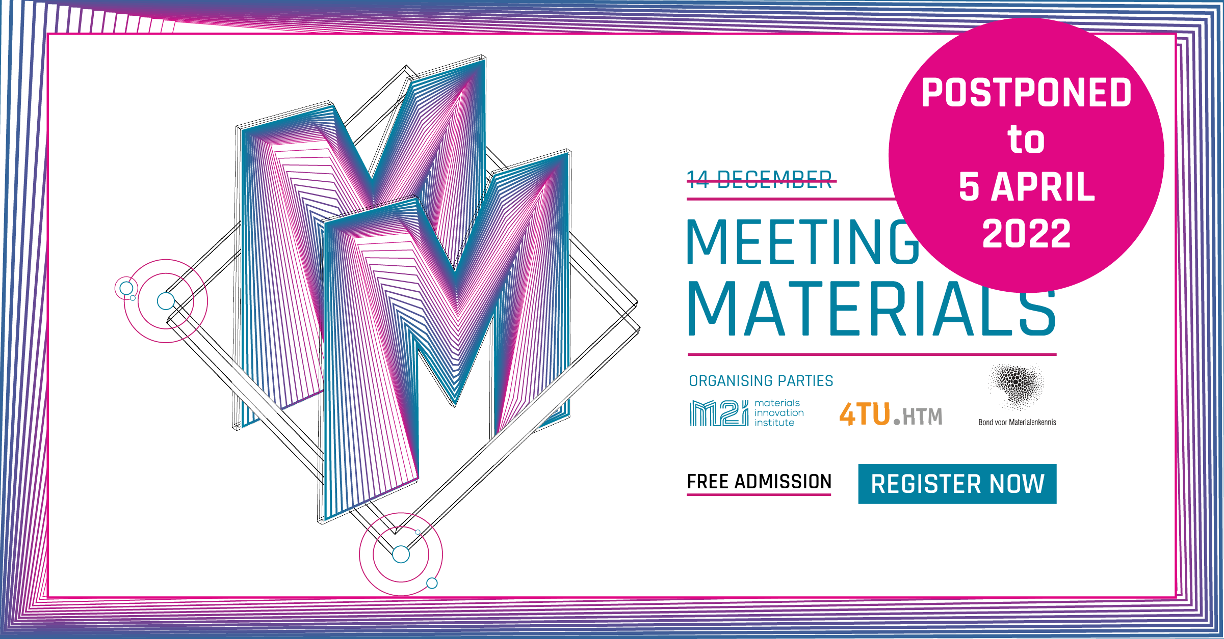 Meeting Materials is free of charge and open for everyone who is interested in materials development. The conference is an opportunity to learn about the latest insights and developments in the field of innovative and smart materials, along with ways in which these materials can stimulate economic progress and a sustainable society. This day is co-organised with 4TU.HTM and supported by the Bond voor Materialenkennis (BvM).